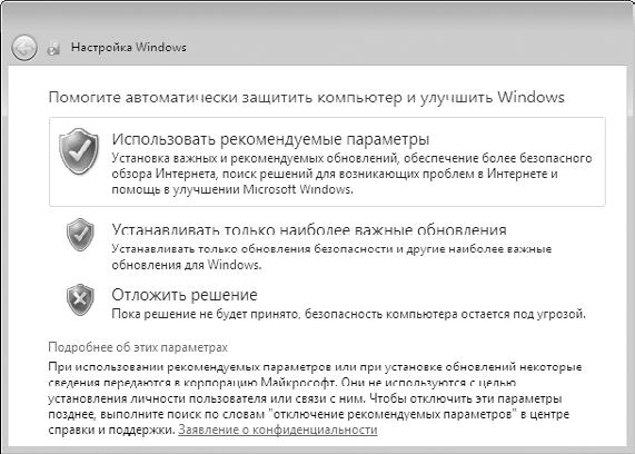 Установить рекомендуемые системой параметры безопасности или отложить настройку безопасности на более позднее время (рис. 2.15).