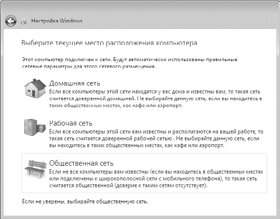 6. Если программа установки обнаружит подключение к локальной сети, то вам будет предложено выбрать сетевое расположение (рис. 2.17). Подробнее о сетевых расположениях см. в гл. 8. При наличии в системе беспроводного адаптера вам может быть предложено подключиться к беспроводной сети.
