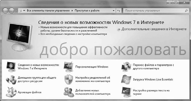 Для выполнения некоторых типичных задач после установки Windows 7 можно использовать окно Приступая к работе (рис. 2.18), ссылка на которое будет присутствовать в верхней части меню Пуск.