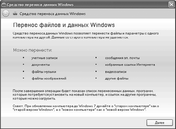Рис. 2.19. Стартовое окно Средства переноса данных Windows