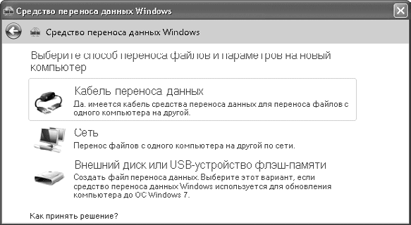 4. Щелкните на кнопке Далее в первом окне программы, после чего выберите способ переноса (рис. 2.20). Если старый и новый компьютеры не подключены к одной сети или же вы выполняете перенос данных в новую операционную систему на одном и том же компьютере, то следует просто сохранить файлы и параметры на сменный носитель либо в папку на жестком диске. В таком случае выбирайте вариант Внешний диск или USB-устройство флэш-памяти.