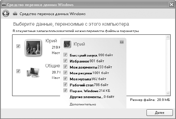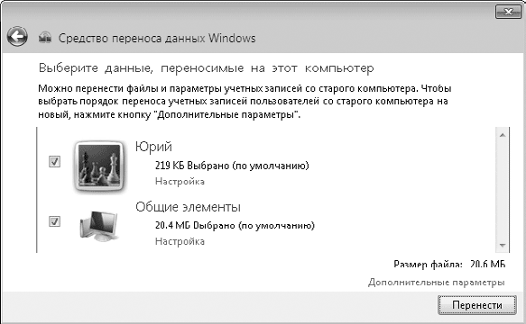 6. После завершения анализа программа отобразит общий размер выбранных файлов и параметров для каждой учетной записи, а также размер общих файлов. Щелкнув на ссылке Настройка, вы можете отменить перенос некоторых файлов и параметров, сняв соответствующие флажки (рис. 2.21).