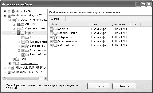 7. Чтобы более тщательно выбрать файлы для переноса, щелкните на ссылке Дополнительно. В появившемся окне (рис. 2.22) вы можете выбрать для переноса любые папки на вашем компьютере, устанавливая соответствующие им флажки. Однако не следует увлекаться и отмечать все папки подряд, поскольку размер архива может существенно увеличиться.