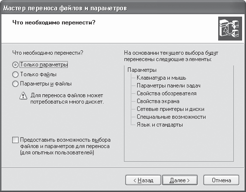 В следующем окне мастера (рис. 1.19) следует выбрать, что именно необходимо перенести: Только параметры, Только файлы или Параметры и файлы. В правой части окна отобразится содержимое всех параметров или файлов (в зависимости от того, что выбрано в левой части).