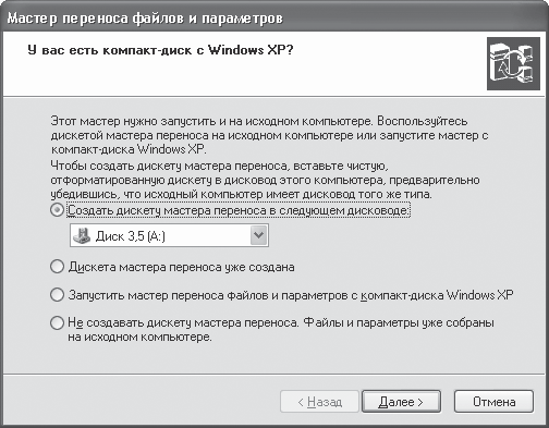 Чтобы создать такую дискету, выполните команду Пуск ►Все программы ►Стандартные ►Служебные ►Мастер переноса файлов и параметров. В первом окне мастера следует выбрать, на каком компьютере запущен мастер. Установите переключатель в положение Новый компьютер и нажмите кнопку Далее. Вставьте в дисковод отформатированную дискету и в следующем окне мастера выберите Диск 3,5 (А:). Затем снова нажмите кнопку Далее. Через некоторое время дискета будет создана.