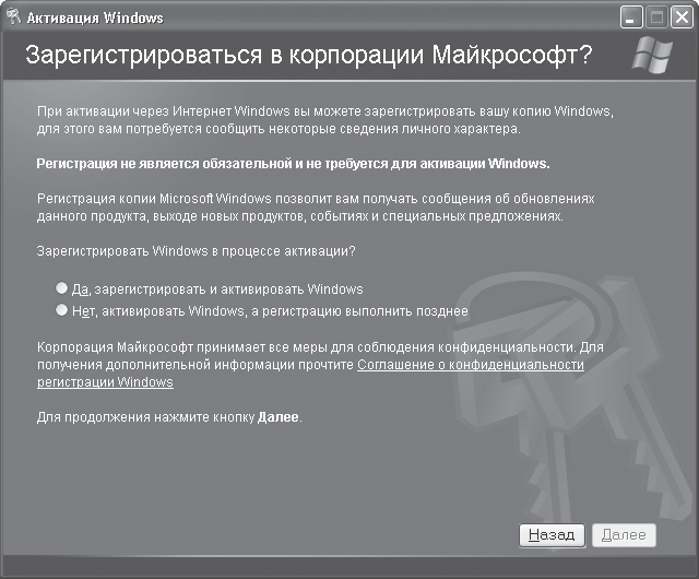 При выборе первого варианта перед вами появится окно с предложением зарегистрироваться (рис. 1.23). Регистрация является необязательным условием использования операционной системы, поэтому вы можете выбрать вариант Нет, активировать Windows, а регистрацию выполнить позднее.