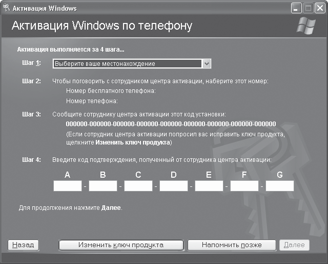 Если вы решили активировать Windows по телефону (например, при отсутствии соединения с Интернетом), то перед вами появится окно, изображенное на рис. 1.25.
