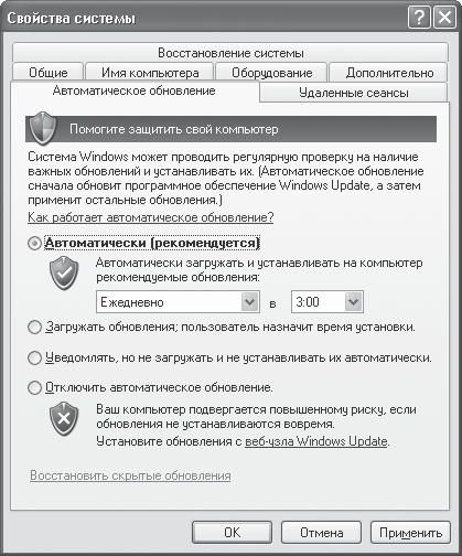 По умолчанию обновление операционной системы происходит в автоматическом режиме. Чтобы получить доступ к настройкам автоматического обновления системы, выполните команду Пуск ►Панель управления, выберите категорию Производительность и обслуживание, щелкните на значке Система и в открывшемся окне Свойства системы перейдите на вкладку Автоматическое обновление (рис. 1.26).