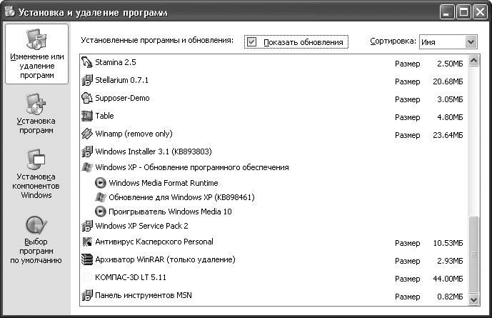 Вы сможете ознакомиться со списком установленных обновлений, выполнив команду Пуск ►Панель управления, выбрав категорию Установка и удаление программ и установив в открывшемся окне флажок Показать обновления (рис. 1.27).