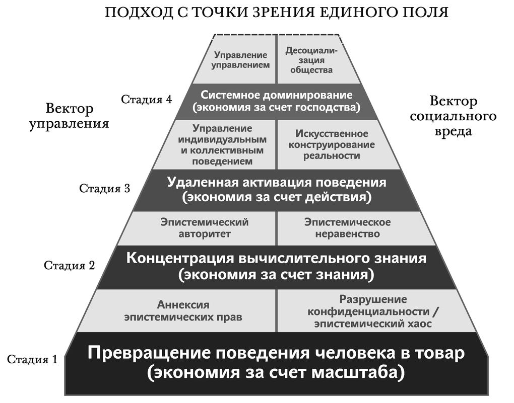 Более 100 лет тому назад молодой Дюркгейм приступил к объяснению «разделения общественного труда» как основы социального порядка в зарождающуюся индустриальную эпоху. Он предостерегал читателей: «наша точка зрения на разделение труда отличается от точки зрения экономистов» (Durkheim, 1964, p. 275; Дюркгейм, 1990, с. 257). Точно так же наша точка зрения на стадии развития институционального порядка надзорного капитализма отличается от точки зрения экономистов. Помимо экономических достижений, каждая новая стадия все больше заполняет пространство, оставленное демократиями, которые не сумели вовремя установить контроль над цифровой сферой информации и коммуникации. В этом процессе новые экономические операции каждой стадии приводят в движение и неразрывно связывают с собой два сопутствующих вектора антиутопических последствий. Я называю их «вектором управления» и «вектором социального вреда».