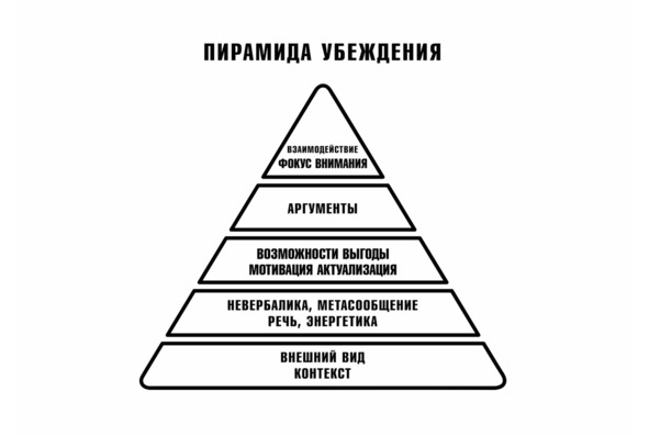 Понимая особенности восприятия публики, спикер способен подобрать эффективный используя инструменты, относящиеся к каждому уровню Пирамиды – от подходящего внешнего вида, невербального и речевого поведения до подбора понятных аргументов и применения приемов взаимодействия. Код убеждения,