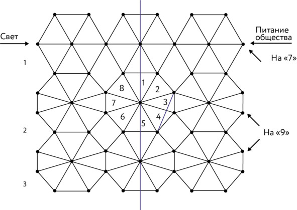 На «9» – деформированная часть ячеек, паразитирующая, распадающаяся опухоль, преобразование её возможно только при перестройке генетического кода общественной формации. Преобразование начинается с 1-го ряда посылкой импульсов света мутирующих индивидуумов. Ущербные гены преобразуются, неспособные к преобразованию и энергетической перестройке индивидуумы выталкиваются из системы на самостоятельное существование и индивидуальное построение «семьи». Сектор 2—2 построение 3—4, – наиболее вероятный выброс лишнего из системы преобразовании начато.