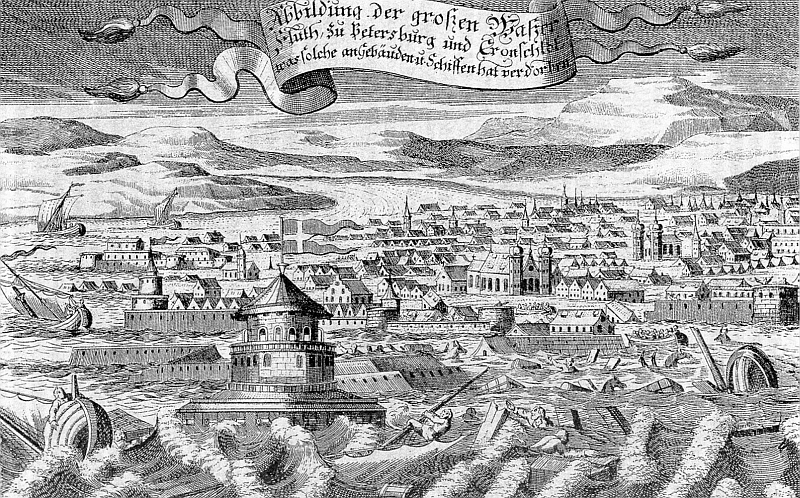 Свое первое наводнение новый столичный город испытал через три месяца после официального рождения, в ночь с 19 на 20 августа 1703 года. Поднявшаяся более чем на два метра вода унесла тогда почти весь строительный материал, заготовленный для возведения Петропавловской крепости. Командующий русской армией князь А.И. Репнин рапортовал царю: «Зело, государь, у нас жестока погода с моря… жители здешние сказывают, в нынешнем времени всегда то место заливает».