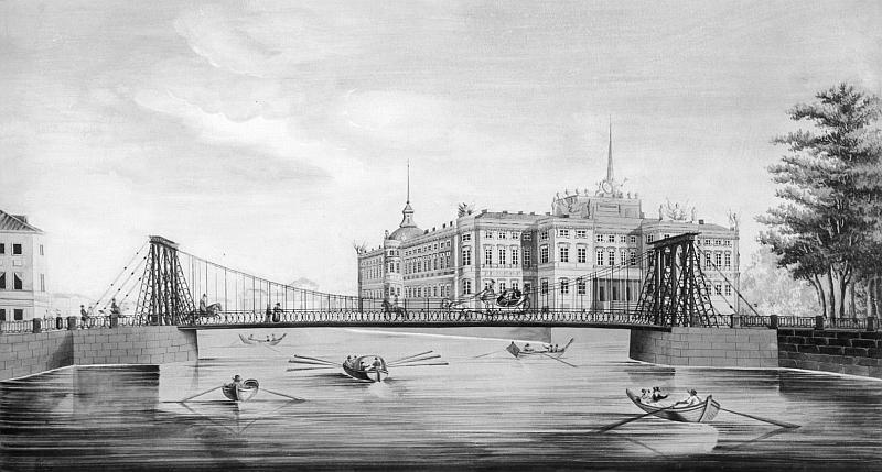 Исток Мойки из Фонтанки. Пантелеймоновский цепной мост через Фонтанку. Михайловский замок и Летний сад. Литография Ф. Кнорре. 1824 г.