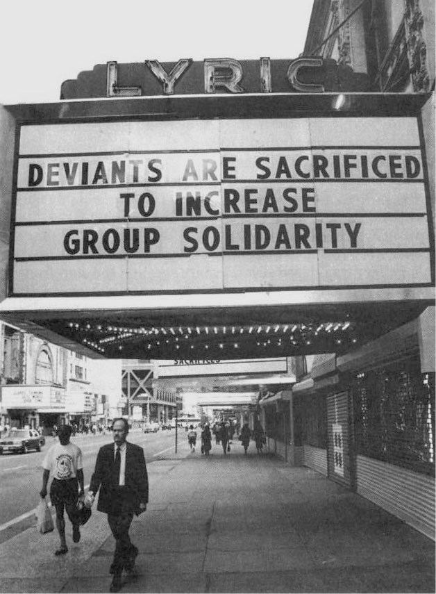 Илл. 6. Искусство как стратегия реконструкции: первая арт-инсталляция на Таймс-сквер, 1993. НАДПИСЬ: «Люди с отклонениями приносятся в жертву во имя групповой солидарности».