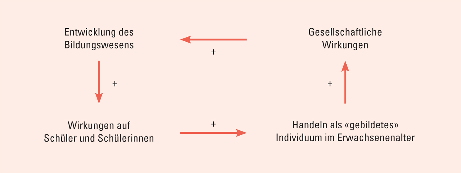 In dieser Betrachtungsweise erscheint es einleuchtend, dass das Handeln schulisch gebildeter Erwachsener in seiner Summe dazu führt, dass es der Gesellschaft gut geht; dass sie in wirtschaftlicher und technologischer Hinsicht gedeiht und sich weiter entwickelt; dass die Demokratie funktioniert; dass Gesellschaften in der Lage sind, Probleme wie Hunger, Säuglingssterblichkeit, Gewalt, Aids und Umweltprobleme besser in den Griff zu bekommen. Was die westliche Welt betrifft, sorgen mächtige Organisationen wie die OECD und die EU dafür, dass die Wahrnehmung der Bildung als eines über Wettbewerbsfähigkeit entscheidenden Faktors aufrechterhalten bleibt. Und in dem Masse, wie Bildung zu all dem in der Lage ist beziehungsweise zu sein scheint – und hier schliesst sich der Kreis –, erarbeitet sich die Gesellschaft auch die materiellen und kulturellen Mittel, das Bildungswesen noch weiter zu entwickeln, es auszuweiten und qualitativ zu verbessern.