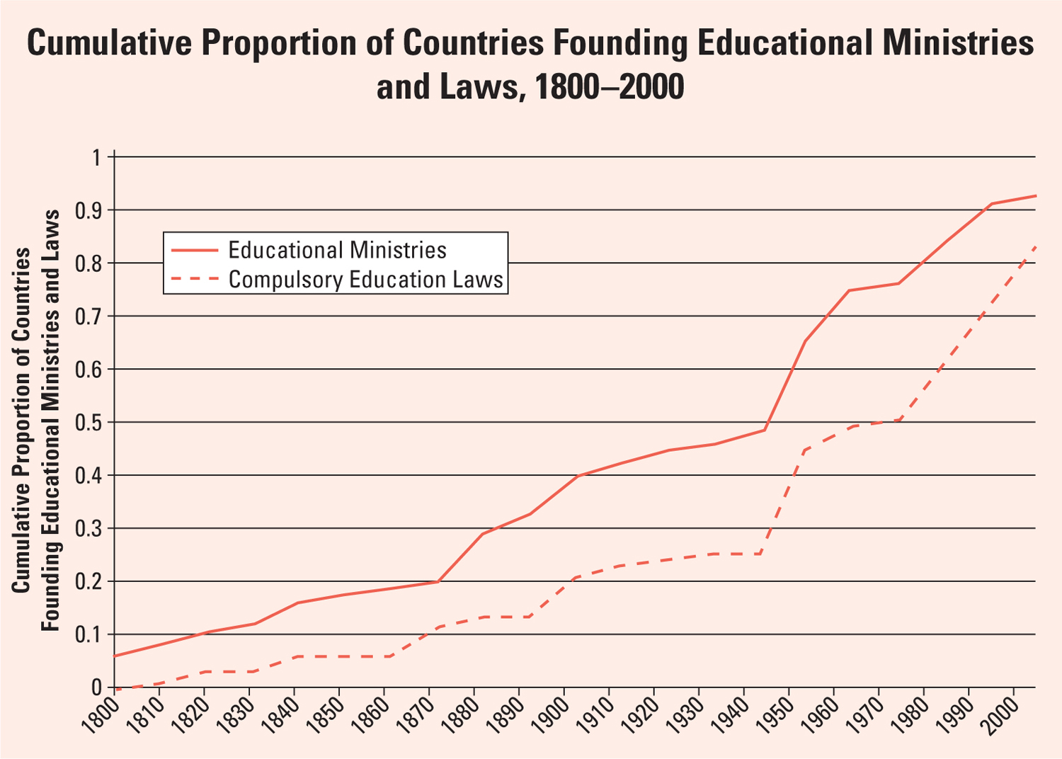 Man mag sich fragen, wie es dazu gekommen ist, dass sich eine bestimmte, ursprünglich in den Ländern des Westens entwickelte Form der Institutionalisierung von Bildung in verhältnismässig kurzer Zeit weltweit zu etablieren vermochte. Auf den ersten Blick widerspricht dies dem, was man intuitiv annehmen würde und was Durkheim auch klar formuliert hatte: dass nämlich die Art und Weise, wie Bildung in einer Gesellschaft organisiert ist, eng mit der jeweiligen Gesellschaftsstruktur zusammenhängt. Und unter dieser Voraussetzung müsste man bezüglich des Bildungswesens grosse Unterschiede beispielsweise zwischen noch stark agrarisch geprägten Gesellschaften und modernen «Wissensgesellschaften» erwarten.