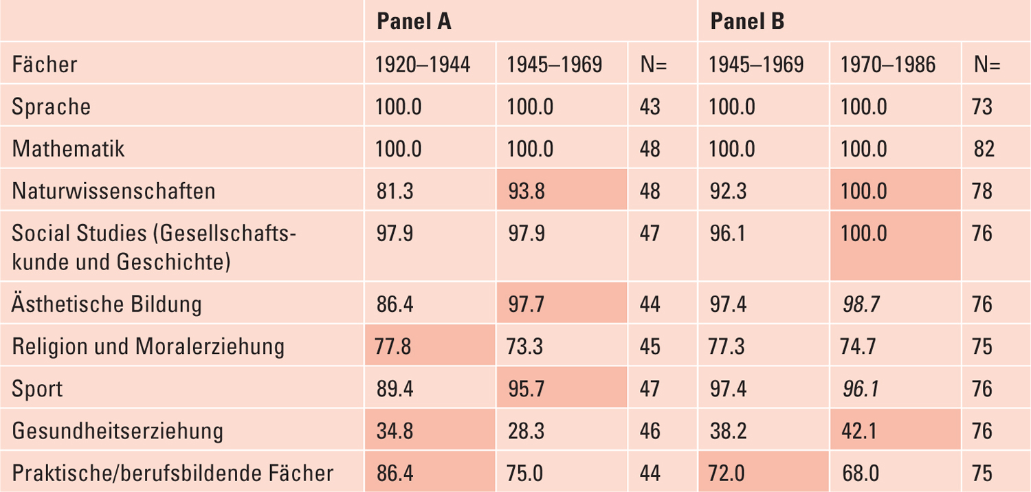 In der Studie wurden zwei Gruppen von Ländern untersucht und je über zwei Perioden in Bezug auf den Fächerkanon der Primarschule verglichen (Abbildung 5). Die erste, «Panel A», umfasste insgesamt 48 Länder, für die Angaben zur Periode 1920–1944 und 1945–1969 einigermassen vollständig ermittelt werden konnten. Für eine zweite, grössere Gruppe, «Panel B», konnten Daten von mindestens 75, im besten Fall gar 82 Ländern ebenfalls zur Periode 1945– 1969 und ausserdem auch für 1970–1986 ermittelt werden. Die Tabelle auf Seite 40 zeigt jeweils für beide Zeitabschnitte, in welchem Masse (ausgedrückt in Prozent der in den Vergleich einbezogenen Länder) die links erwähnten Fächer beziehungsweise Fächergruppen im Lehrplan aufgeführt waren. Die Ergebnisse für Panel A zeigen einerseits eine Zunahme des Anteils bei Naturwissenschaften, ästhetischer Bildung und Sport, anderseits eine Abnahme für Religion/Moralerziehung, Gesundheitserziehung und praktisch/berufsbildende Fächer. Anders bei Panel B: Mit Ausnahme der praktisch/berufsbildenden Inhalte nimmt die Übereinstimmung zu oder bleibt der Anteil einigermassen konstant. Insgesamt ist die Situation ab den 1970er-Jahren dadurch gekennzeichnet, dass alle Länder Sprache und Mathematik (dies schon im früheren 20. Jahrhundert) sowie Naturwissenschaften und Social Studies (Gesellschaftskunde und Geschichte) als eigene Fächer in ihren Lehrplänen aufführen. Auf einen fast ebenso hohen Wert bringen es ästhetische Bildung und Sport.
