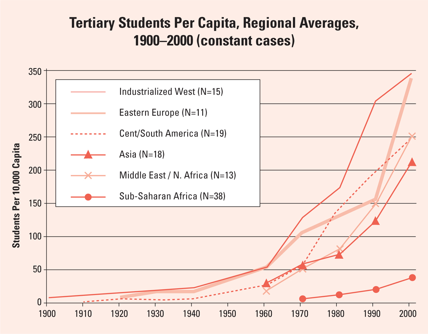 Dass dies nicht einfach eine Folge der Bevölkerungsexplosion gewesen ist, belegt Abbildung 3. Sie zeigt, dass sich der Anteil der in tertiären Bildungseinrichtungen Eingeschriebenen an der Gesamtheit der jeweiligen Bevölkerung im selben Zeitraum von weniger als 0.5 Prozent auf 2–3.5 Prozent erhöht hat. Und das nicht einfach nur im hoch entwickelten Westen sondern, mit Ausnahme von Schwarzafrika, in allen Weltregionen.