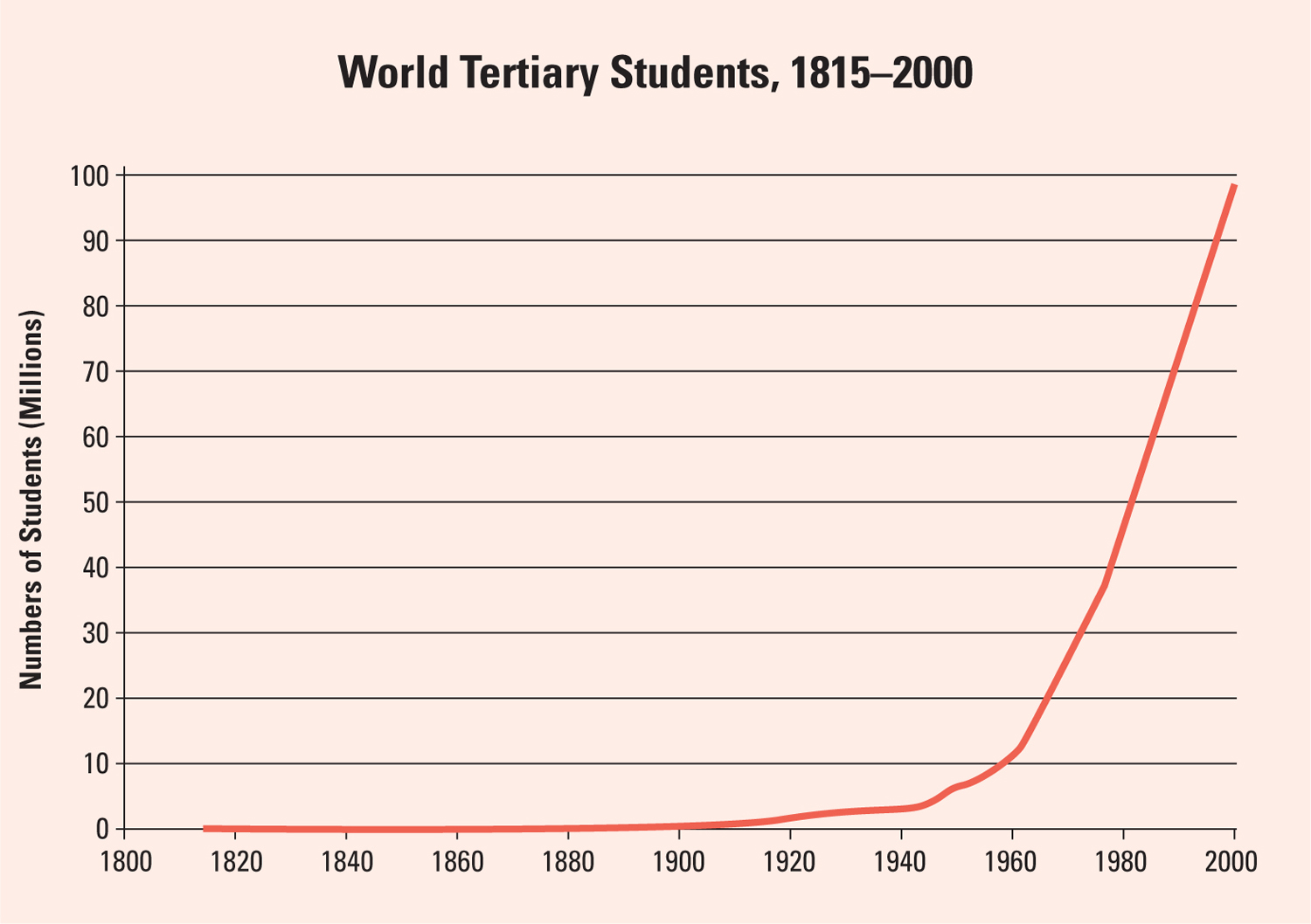 Da wäre zunächst einmal die Expansion der tertiären Bildung ins Auge zu fassen. Wie die Abbildung 2 auf Seite 34 zeigt, erfuhr diese weltweit ein exponentielles Wachstum. In wenig mehr als einem guten halben Jahrhundert nahm die Zahl der Studierenden auf dieser Stufe von etwa 4 auf rund 100 Millionen zu.