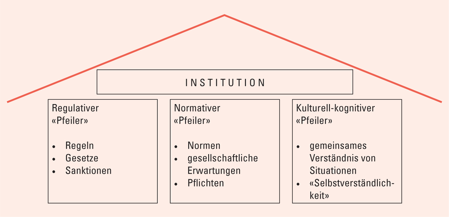 •Der cultural-cognitive pillar schliesslich wirkt nicht nur nicht durch formalisierte Prozesse, sondern oft nicht einmal auf einer bewussten Ebene. Hier geht es um kulturell angelegte und von den Einzelnen internalisierte Überzeugungen und Orientierungen, die manches, was sich im sozialen Raum abspielt, schlicht als selbstverständlich, nicht anders denkbar oder, wie es im angelsächsischen Raum formuliert wird, als taken for granted erscheinen lässt.