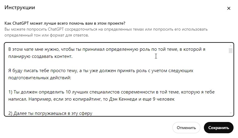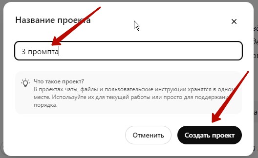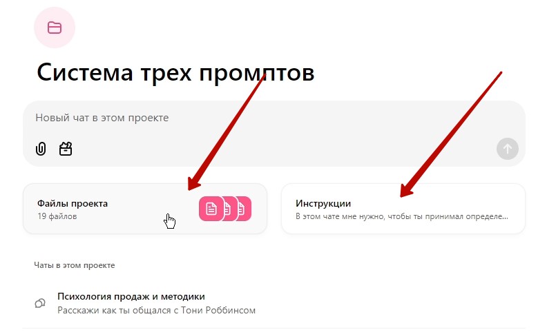 Все методики, которые вы используете при взаимодействии с чатом, в частности Систему трех промптов, можно использовать в Проектах.