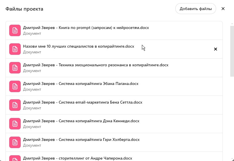 -– Файлы проекта – это те материалы, на которые будет опираться нейросеть при генерации ответов внутри данного проекта.