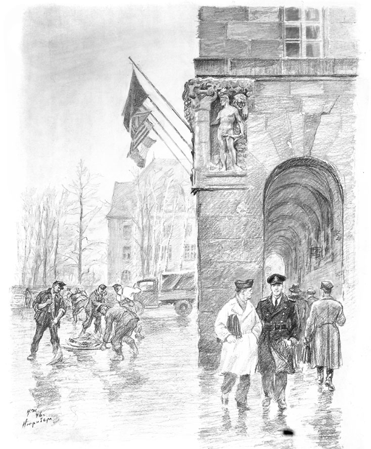 Жуков Н. Н. Рисунок «У здания трибунала (Нюрнберг, 1946 г.)»
