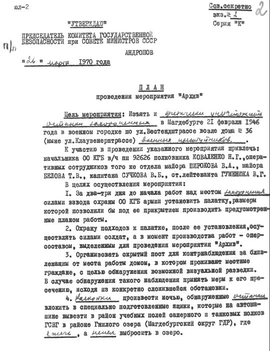 Согласно плану проведения мероприятия «Архив», утвержденного председателем КГБ при СМ СССР 26 марта 1970 г., оперативная группа в составе начальника ОО КГБ при СМ СССР в/ч п/п 92626 полковника Коваленко Н. Г. и оперативных сотрудников того же отдела майора Широкова В. А., майора Белова Т. В., майора Суслина В. И., старшего лейтенанта Гуменюк В. Г. произведено вскрытие захоронения останков военных преступников в военном городке по Вестендштрассе возле дома № 36 (ныне Клаузенерштрассе).
