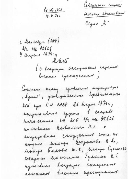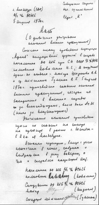 К участию в проведении указанного мероприятия привлечь: начальника ОО КГБ в/ч п/п 92626 полковника КОВАЛЕНКО Н. Г., оперативных сотрудников того же отдела майора ШИРОКОВА В. А., майора БЕЛОВА Т. В., капитана СУЧКОВА В. Б., ст. лейтенената ГУМЕНЮКА В. Г.