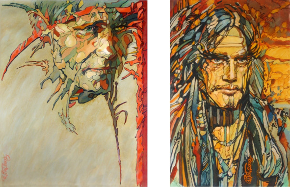 В подобном стиле, как иллюстрации к роману «Мастер и Маргарита», были сделаны и ранние автопортреты 1993 года.