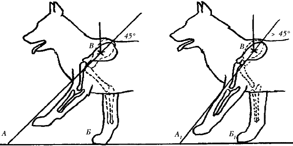 Если же у немецкой овчарки наблюдается отклонение от стандарта, т. е. угол сочленения больше 45°, то уменьшается вымах лапы, смещается центр вращения лопатки и собаке приходится тратить больше сил, чтобы стоять, что ведет к увеличению утомляемости.