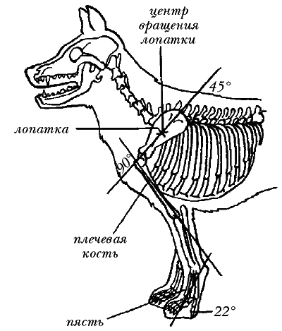 Еще один немаловажный параметр для передних конечностей – это угол между лопаткой и плечом, который должен составлять 90°.