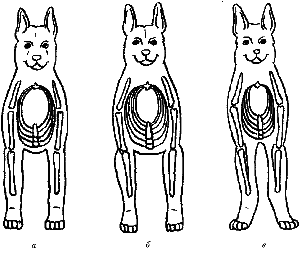 Постав передних конечностей: а – правильный постав передних конечностей при хорошо сформированной грудной клетке; б – косолапость, обусловленная бочкообразной грудной клеткой и вывернутыми наружу локтями и плечами; в – суженная грудная клетка и сближенные лок