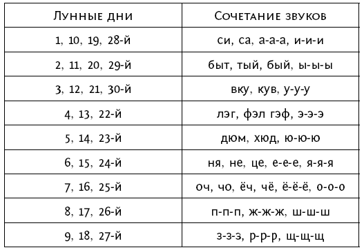 Например, в таблице 6 представлен примерный перечень звуков, которые полезно было бы произносить в разные лунные дни.
