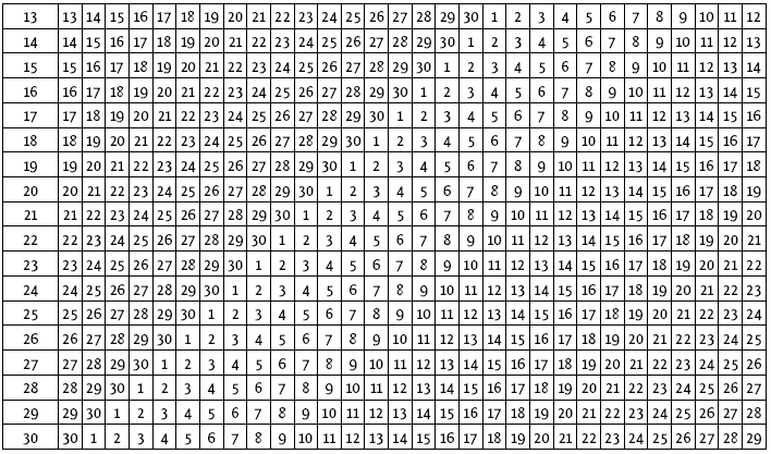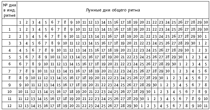 Действие первого собственного лунного ритма разворачивается не на физическом плане бытия, а на энергетическом или астральном плане жизни человека. Этот ритм позволяет определить, какие дни лунного месяца будут нести с собой испытания, уроки и провокации именно для этого человека. Ведь в этом ритме будут «свои» опасные 9-й, 15-й, 23-й и 29-й дни по порядку в череде дней лунного месяца. Они будут проявляться на эмоциональном плане жизни, создавая особые психологические трудности в жизни человека. В таблице 7 представлена матрица развертывания индивидуального лунного ритма для всех дней общего лунного месяца, который носит название «Лунная рулетка».